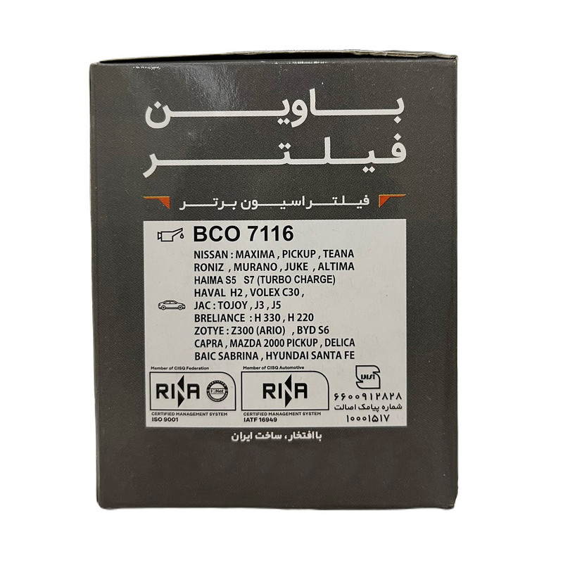 فیلتر برند باوین زیر مجموعه باکیفیت برند تکساز فیلتر است که این فیلتر دارای آرم استاندارد می باشد و دارای کیفیته ساخت بالایی است همچنین قدرت جرم گیری بسیار زیادی دارد و از قطعاته موتور خودروی شما محافظت می کند ،اگر موتور خودروی شما مدت زمان زیادی در طول شبانه روز روشن است ، و یا در شهرهای شلوغ رفت و امد زیاد دارین و یا اهله رانندگی پر فشار و اسپورت هستین ما این فیلتر روغن را حتما به شما پیشنهاد می کنیم.