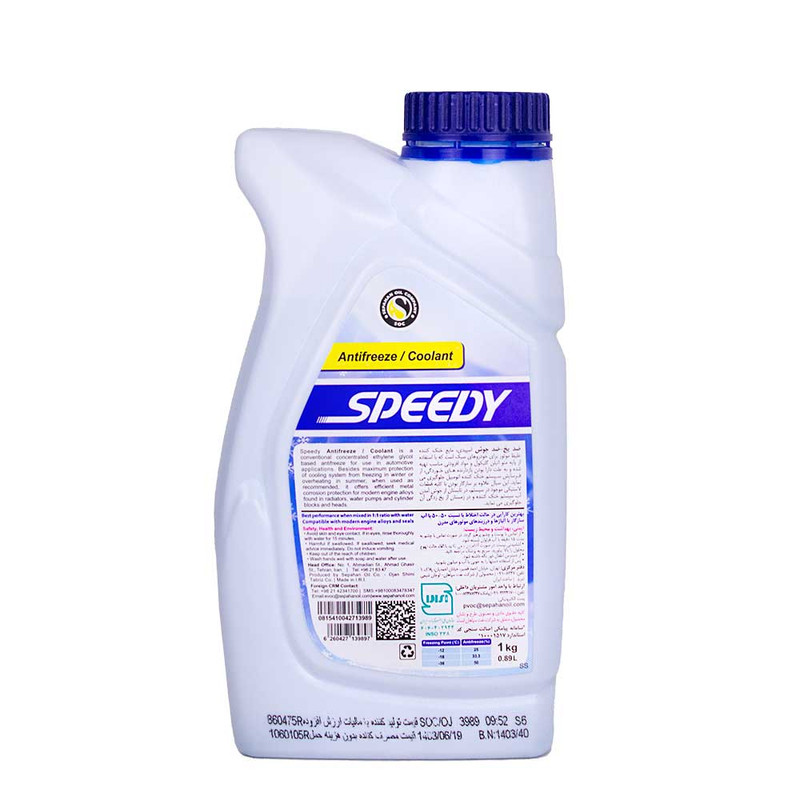 ضد یخ - ضد جوش اسپیدی، مایع خنک کننده غلیظ موتور است که با استفاده از پایه مونواتیلن گلیکول و مواد افزودنی مناسب ضد خوردگی تهیه شده و به علت دارا بودن بازدارنده های خوردگی، از فرسایش سیستم خنک کننده اتومبیل جلوگیری می نـماید؛ ضمن این که با کلیه قطعات لاستیکی موجود در سیستم سازگار است. این سیال در تابستان از جوش آمدن آب سیستم خنک کننده و در زمستان از یخ زدگی آن جلوگیری می نـماید. موارد کاربرد: سیستم خنک کننده انواع خودروهای سواری، سیستم های خنک کننده صنعتی.
