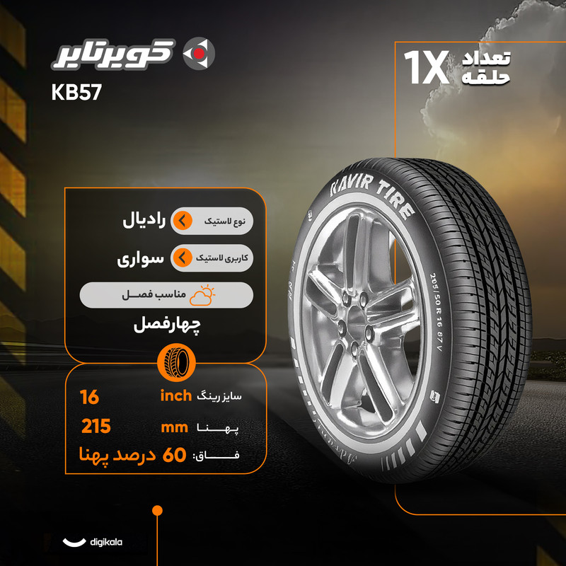 عملکرد اسپرت آن با شاخص سرعت W تأیید میشود که پایداری و اطمینان را تا سرعت ۲۷۰ کیلومتر بر ساعت فراهم میکند. در عین حال، رتبه A در مصرف سوخت، نشاندهنده مهندسی پیشرفته آن برای کاهش مقاومت غلتشی و صرفهجویی در هزینههاست. این محصول رادیال که تولید سال ۲۰۲۵ است، برای کاربری خودروهای سواری مدرن طراحی شده است. این لاستیک با پهنای ۲۱۵ میلیمتر، فاق ۶۰ درصد پهنا و برای رینگهای ۱۶ اینچی، گزینهای ایدهآل برای خودروهایی نظیر تویوتا کمری و هیوندای سوناتا است و از ویژگیهای خاص آن میتوان به گارد محافظ رینگ اشاره کرد. در نهایت، لاستیک کویر تایر مدل KB57 برای رانندگانی که بهترین عملکرد را در تمام زمینهها میخواهند، انتخابی بیچون و چرا است.