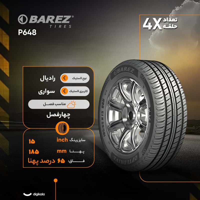 لاستیک خودرو بارز مدل P648 سایز ۱۸۵/۶۵R۱۵ یکی از محصولات باکیفیت ایرانی در دسته لاستیکهای رادیال است که برای خودروهای سواری طراحی شده است. این مدل مناسب برای استفاده در تمام فصول سال بوده و عملکرد پایداری را در شرایط مختلف جوی ارائه میدهد.