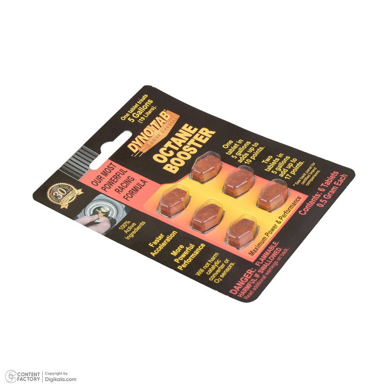 مکمل تقویت کننده سوخت و افزایش دهنده اکتان (اکتان بوستر) داینوتب-Dyno Tab ، با اضافه کردن یک قرص در هر 19 لیتر بنزین ( 5 گالن ) باعث افزایش 10 واحدی در اکتان و با اضافه کردن 2 قرص در 19 لیتر بنزین اکتان را به 17 واحد افزایش دهید .عملکرد بالای اکتان تقویت شده Dyno-tab تست شده در آزمایشگاه های مستقل می باشد .این این محصول، حلال، پرسرعت و ایمن برای مبدل های کاتالیزوری و سنسورهای اکسیژن می باشد و هیچگونه صدمه ای به کاتالیزور و سنسور اکسیژن خودروی شما وارد نمیکند