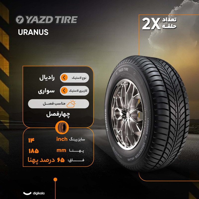 لاستیک یزد تایر 185/65R 14 گل اورانوس، یک لاستیک چهار فصل است که عملکرد خوبی را در تمام فصول ارائه می دهد. این لاستیک برای اتومبیل های سواری با کد سرعت H و شاخص وزن 86 طراحی شده است. لاستیک یزد تایر 185/65R 14 گل اورانوس برای اتومبیل هایی مثل پژو 206، پژو 405 و پژو پارس مناسب است.