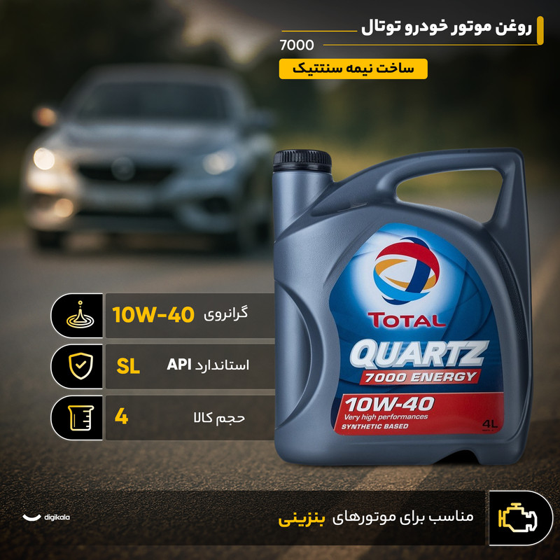 این روغن از استاندارد API SL پیروی کرده و در حجم کالا ۴ لیتر و در نوع محفظه بطری عرضه میشود. روغن موتور توتال ۷۰۰۰ برای موتورهای بنزینی مناسب است و برای نوع خودروهای سواری، SUV و وانت توصیه میشود. این روغن به طور خاص برای طیف وسیعی از خودروهای داخلی و خارجی مانند پژو ۴۰۵، پژو پارس، سمند، رنو L90، پژو ۲۰۶، پراید و همچنین هیوندای ورنا و نیسان ماکسیما مناسب است و به محافظت از موتور در برابر فرسایش و رسوب کمک میکند.