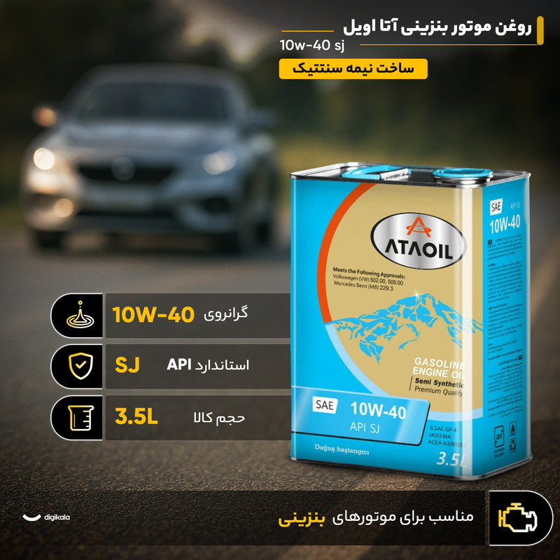 روغن موتور آتا اویل مدل 10W-40 SJ با فناوری نیمهسنتتیک (Semi-Synthetic) تولید شده و گزینهای مطمئن برای خودروهای بنزینی است که به دنبال عملکرد پایدار و محافظت مناسب از موتور در شرایط مختلف دمایی هستند. این محصول با استاندارد جهانی API SJ و تاییدیههای رسمی خودروسازان معتبر مانند مرسدسبنز MB 229.3 و فولکسواگن 502.00 / 505.00، کیفیت و کارایی خود را در موتورهای مدرن و نیمهمدرن به اثبات رسانده است.