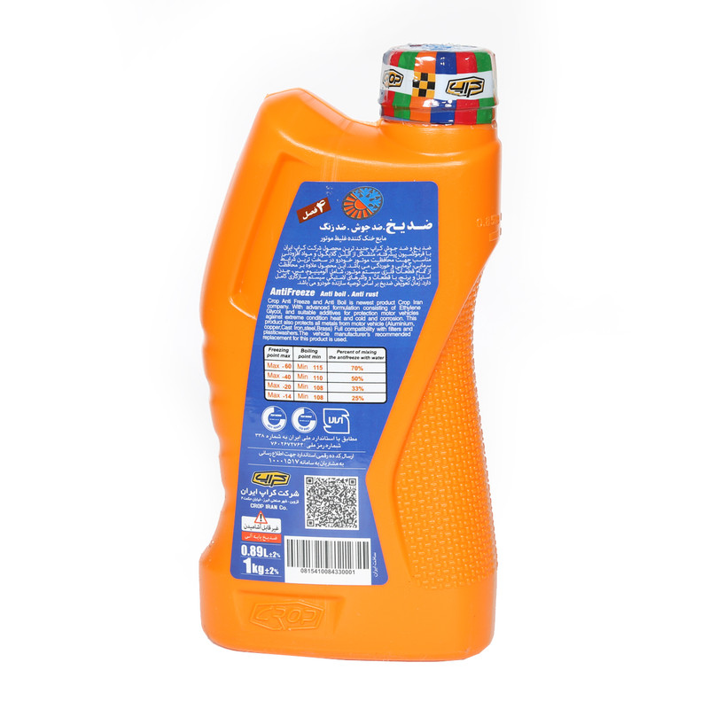 ضد یخ و ضد جوش کراپ جدیدترین محصول شرکت کراپ ایران با فرمولاسیون پیشرفته ،متشکل از اتیلن گلایکول و مواد افزودنی مناسب جهت محافظت موتور خودرو در سخت ترین شرایط سرمایی ، گرمایی و خوردگی می باشد.این محصول علاوه بر محافظت از تمام قطعات فلزی سیستم موتور ، شامل آلومینیوم ، مس ، چدن ، استیل و برنج ، با قطعات و واشرهای لاستیکی سیستم سازگاری کامل دارد.زمان تعویض ضد یخ بر اساس توصیه سازنده خودرو می باشد.