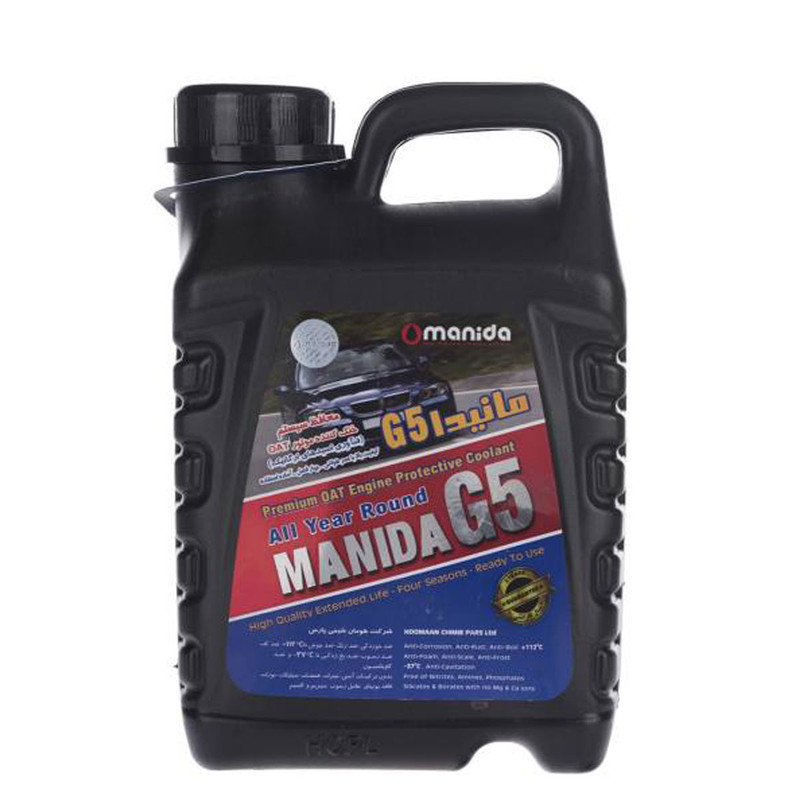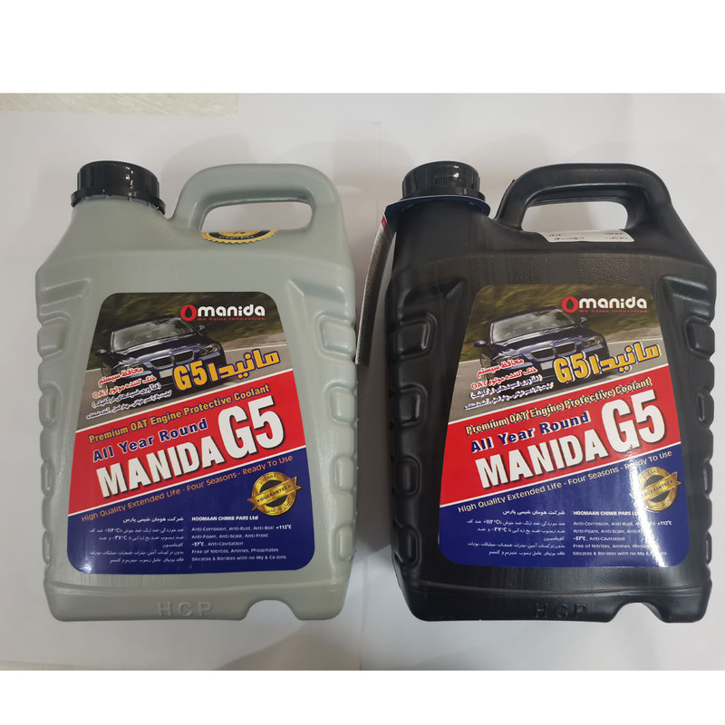 این محصول با بطری بسته بندی به رنگ مشکی و طوسی می باشد ،خنک کردن مناسب موتور یکی از کارهای بسیار حساسی است که تاثیر مستقیمی روی عملکرد خودرو و عمر مفید موتور دارد. برای این منظور از سیالات خنک کنندهای مانند آب و ضدیخها استفاده میشود. محصول فوق را از لحاظ عملکرد میتوان در گروه ضدیخها و ضدجوشها قرار داد؛ با این تفاوت که از مزایای دیگری نیز برخوردار است. این ضدیخ خاصیتی محافظتی داشته و قادر است در مسیر حرکتی خود از بخشهای فلزی و لاستیکی رادیاتور و سیستم خنک کنندهی خودرو محافظت کند. از جملهی فواید محافظتی این محصول میتوان به قابلیتهای ضد زنگ، ضدخوردگی، ضد رسوب و ضد کاویتاسیون اشاره کرد. این محلول هیچ اثر زیان آوری برای سیستم خنک کنندهی خودرو ندارد و با ترکیبات ویژهای که دارد دمای انجماد و جوش را دستخوش تغییر کرده است. این محلول تا دمای مثبت 112 درجهی سانتیگراد جوش نمیآید و تا دمای منفی 37 درجهی سانتیگراد دچار یخ زدگی نمیشود. این محصول را نباید با آب ترکیب کرد و شرکت «مانیدا» (Manida) آن را تحت عنوان مدل «G5» به بازار عرضه میکند. کیفیت و تکنولوژی ساخت در این برند نسبت به برندهای ایرانی و چینی به مراتب بالاتر بوده و سیستم اب خنک خودرو شما را در سردترین و گرمترین نقاط کشور در بهینه ترین حالت قرار می دهد
