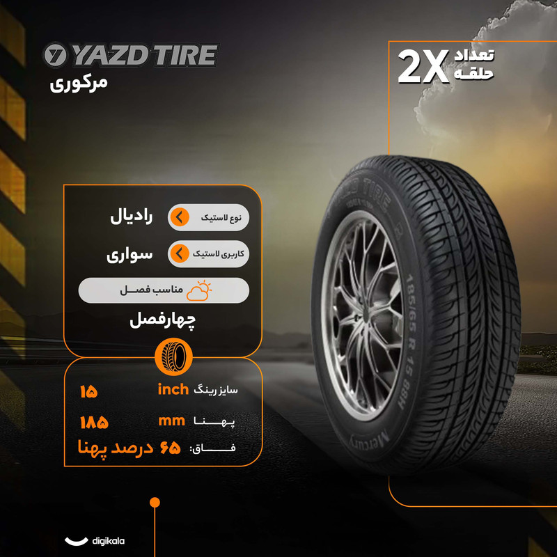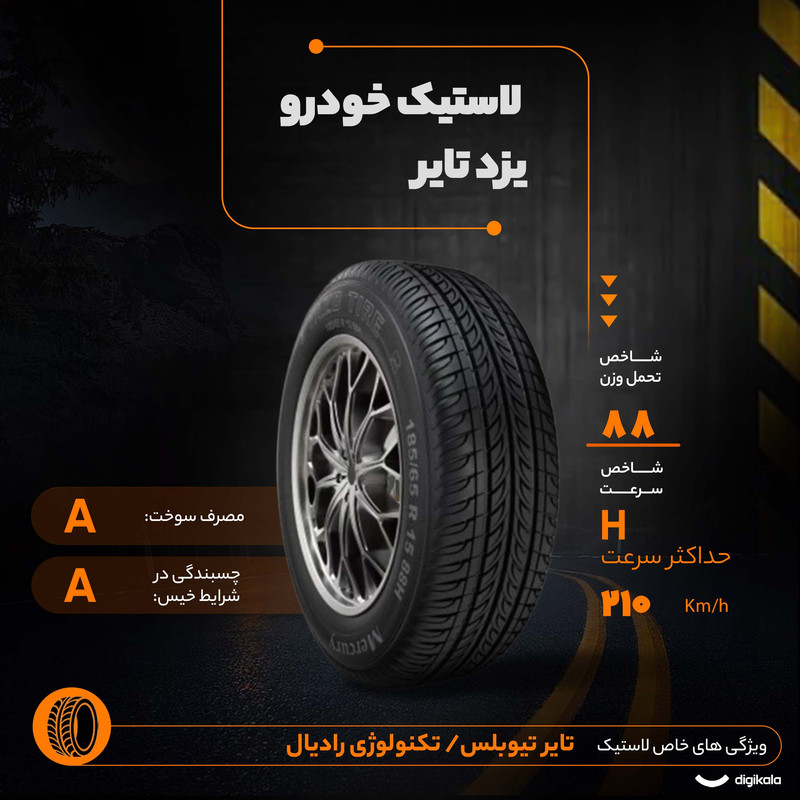 یزد تایر نام تجاری مجتمع صنایع لاستیک یزد است که در سال 1365 فعالیت خود را آغاز نموده است.شرکت لاستیک یزد تایر در حال حاضر به عنوان یکی از بهترین تولیدکنندگان لاستیک در بازار شناخته می شود و لاستیک های یزد تایر در زمره با کیفیت ترین محصولات تولید داخل قرار می گیرند. لاستیک یزد تایر با به کار گیری تکنولوژی شرکت وردشتاین هلند توانسته است یکی از توانمند ترین خط تولیدهای تایر ایرانی را ایجاد کند.در دهه هشتاد شمسی و پس از عقد قرارداد با شرکت وردشتاین و استفاده از تکنولوژی به روز این شرکت، یزد تایر تولید لاستیک رادیال را در دستور کار خود قرار داد و توانست سهم بزرگی بازار ایران و حتی منطقه را در اختیار بگیرد. لاستیک یزد تایر چندین سال متوالی به عنوان صادر کننده نمونه کشوری برگزیده شده است.لاستیک یزد تایر 185/65R 15 گل مرکوری در دسته تایر چهار فصل قرار گرفته و عملکرد قابل قبولی را در مسیر های مرطوب و تابستانی از خود نشان می دهد.به عقیده بسیاری از مصرف کنندگان لاستیک یزد تایر نرم ترین تایر تولید شده در ایران است که همین امر فرمان پذیری خودرو رو افزایش داده و تا حد زیادی ضربات ناشی از ناهمواری های جاده را کاهش می دهد.از سوی دیگر فرمان پذیری بالا باعث شده تا لاستیک یزد تایر طرح مرکوری در پیچ ها و تغییر مسیر ناگهانی عملکرد مناسبی را داشته باشد.تکنولوژی به کار گرفته شده توسط یزد تایر در لاستیک 185/65R 15 گل مرکوری باعث افزایش دوام و کارکرد این محصول شده است و کم شدن مقاومت غلتشی روی کاهش مصرف سوخت تا 20 درصد تاثیر گذار بوده است.