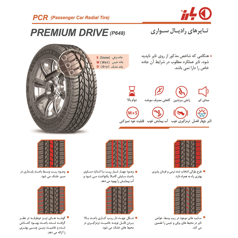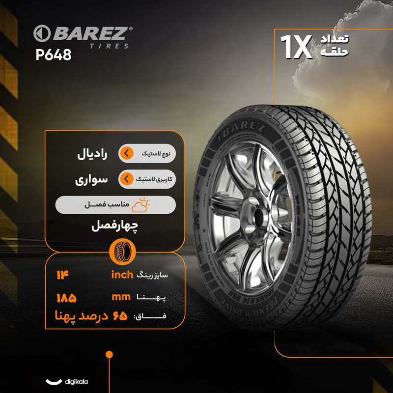 لاستیک خودرو بارز مدل P648 سایز ۱۸۵/۶۵R۱۴ یکی از محصولات پرطرفدار برند ایرانی بارز است که برای خودروهای سواری طراحی شده و از نوع رادیال بهشمار میرود. این لاستیک برای استفاده در تمام فصول سال مناسب بوده و با طراحی آج استاندارد خود، عملکردی متعادل روی سطوح خشک و مرطوب ارائه میدهد.