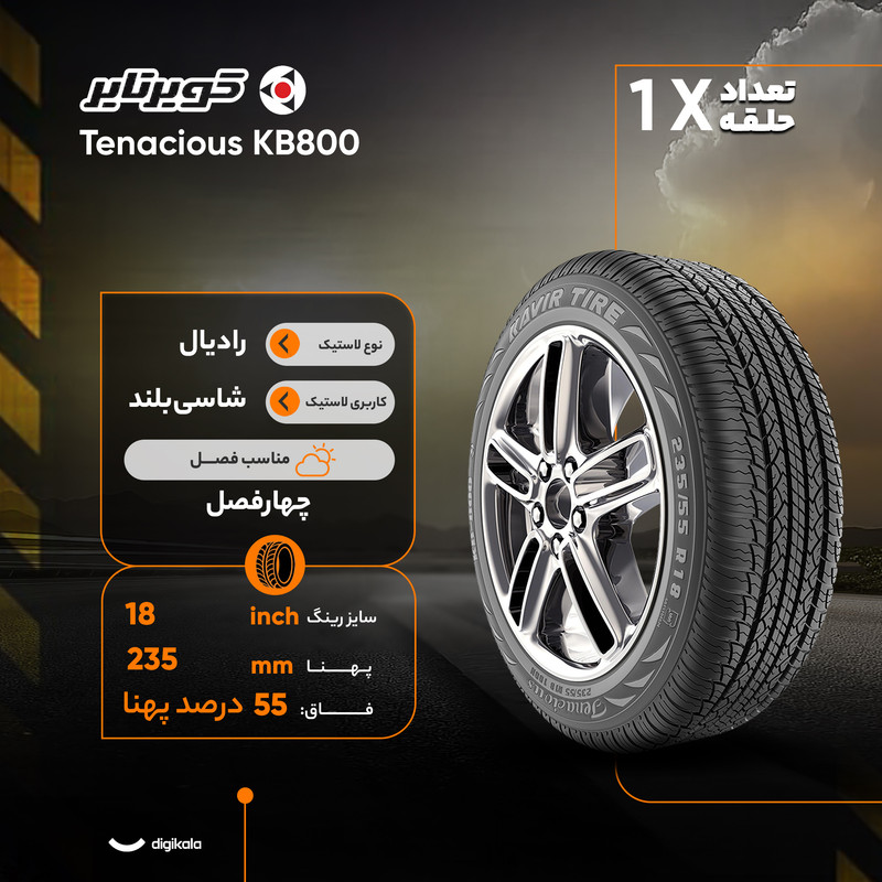 گل KB800 با الگوی خاص خود موجب تخلیهی سریع آب از سطح تماس تایر با جاده میشود و در نتیجه خطر لغزش در مسیرهای خیس و برفی را بهطور چشمگیری کاهش میدهد. ابعاد سایز رینگ ۱۸ اینچ، پهنای ۲۳۵ میلیمتر و فاق ۵۵ درصد نیز تعادلی مناسب میان نرمی حرکت، جذب ضربه و کنترل فرمان ایجاد کرده است.