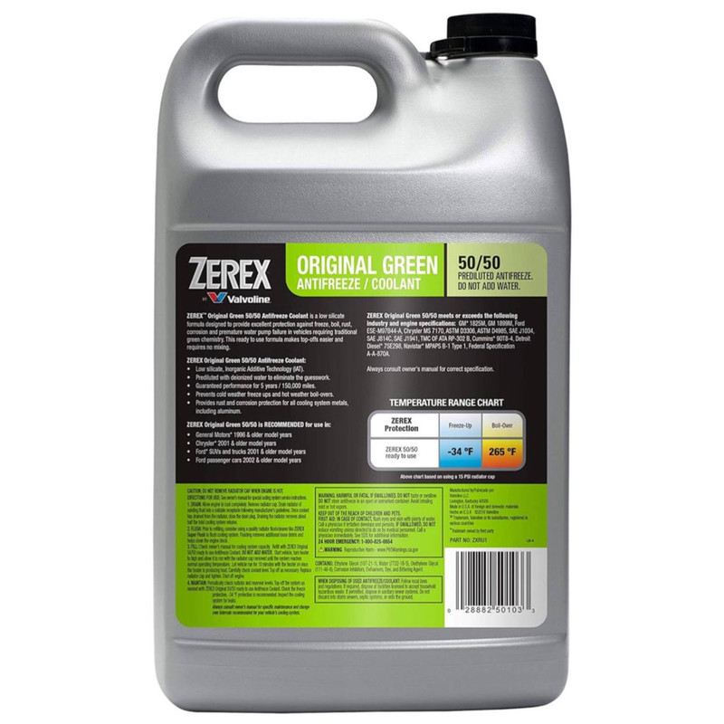 کولانت والوالین زرکس ORGINAL Green با حجم یک گالن (۳/۷۸ لیتر) و رنگ سبز می باشد. ترکیبات کولانت والوالین زرکس سبز شامل 50٪ ضدیخ و 50٪ مایع رادیاتور است و نیازی به اضافه کردن آب ندارد، همچنین ضدیخ GREEN زرکس والوالین برای تمامی وسایل نقلیه ای که از ضدیخ/ضدجوش سبز رنگ تغذیه می کنند مناسب است. فرمولاسیون مدرن کولانت 50/50 والوالین زرکس سبز بر خلاف بسیاری از ضدیخ ها به گونه ای است که علاوه بر حفظ دمای ایده آل موتور خودرو، از سیستم خنک کننده خودرو در برابر استهلاک و خوردگی قطعات محافظت کرده و مانع از تشکیل رسوبات می شود و همچنین دارای بالاترین تاییده ها در حوزه کولانت و ضدیخ است. ضدیخ 50/50 والوالین زرکس در برابر زنگ زدگی از سیستم خنک کننده خودرو محافظت می کند و بهترین عملکرد را در فصول گرم و سرد دارد. جالب است بدانید که کولانت والوالین جز 5 کولانت برتر دنیا به شمار می رود.همچنین طول عمر این محصول 5 سال یا 250/000 کیلومتر است.