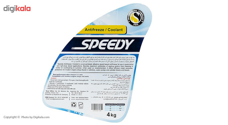 حفاظت از موتور خودرو بهخصوص دربرابر گرما امری بسیار مهم و حیاتی است؛ از اینرو سیستم خنک کنندهی خودرو نقشی بسیار پررنگ دارد. در گذشته بیشتر از آب بهعنوان مبرد این سیستم خنک کننده استفاده میشد اما امروزه ضد یخها جای آن را گرفتهاند. یکی از دلایل این جابهجایی ایجاد خوردگی و زنگزدگی در بخشهای فلزی سیستم خنک کننده بود که آب عامل اصلی آن محسوب میشد؛ از طرفی دیگر دمای انجماد و دمای جوش آب در فصول سرد و گرم سال دردسر ساز بود و موجب یخ زدگی و یا جوش آوردن در بخش سیستم خنک کننده میشد. محصول فوق را شرکت اسپیدی با مدنظر قرار دادن این موارد و نقاط ضعفی که برخی از ضدیخها دارند تولید کرده است. این محصول برپایهی مواد آلی و اتیلن گلیکول تولید شده است که علاوهبر بالا بردن نقطهی جوش و کاهش دمای انجماد بهشکلی مناسب از سیستم خنک کننده و موتور دربرابر خوردگی محافظت میکند. از این ضد یخ میتوان برای خودروهای بنزینی، دیزلی و گازسوز استفاده کرد. این محصول از طول عمر بالایی برخوردار بوده و در تمام فصول سال قابل استفاده است.