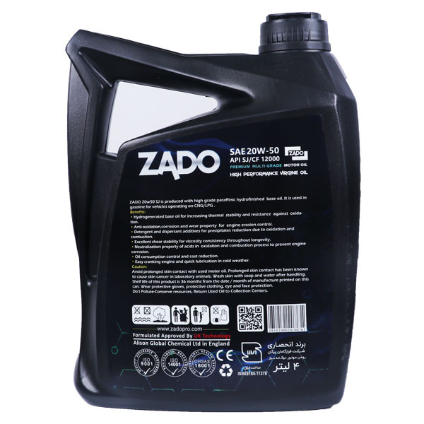 روغن موتور زادو 20w-50/SJ با استفاده از روغن پایه پارافینیک حاصل از پالایش برشی از نفت خام به نام لوب کات (Lube cut) با شاخص گرانروی بالا با انجام فرآیند هیدروژن و مواد افزودنی مرغوب, جهت مصرف در تمام فصول و شرایط آب و هوایی ایران تولید گردیده است.