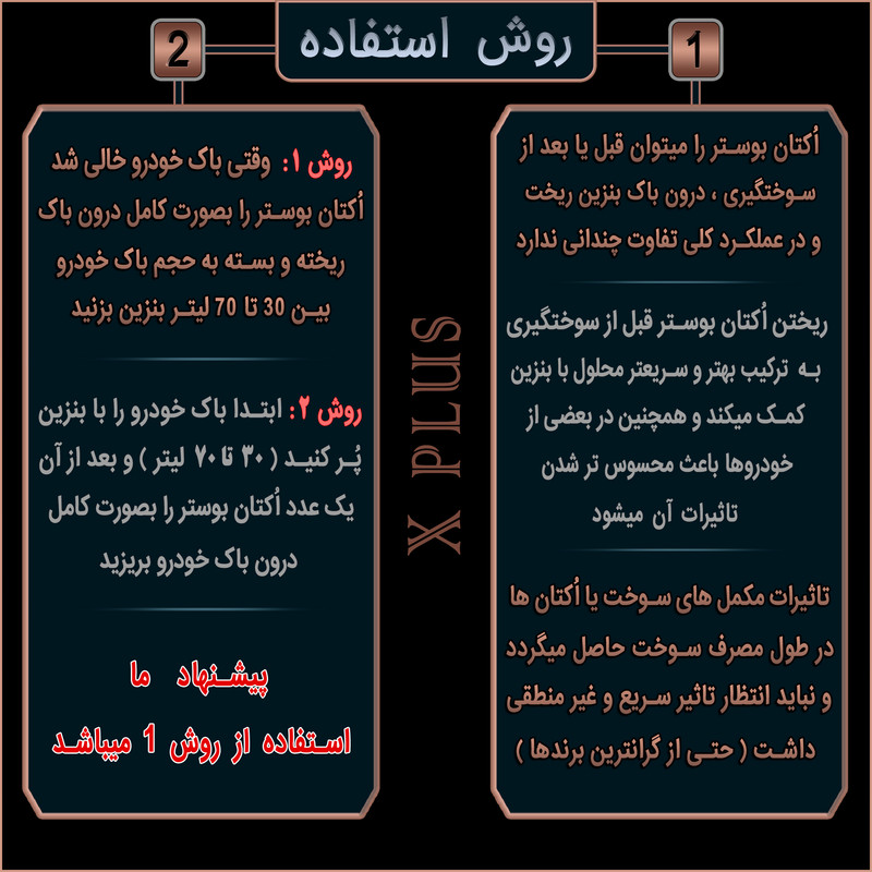 مصرف بالای بنزین خودرو ، خوب کار نکردن موتور و کاهش سرعت و شتاب خودرو ، دلایل متعددی میتواند داشته باشد که اصلیترین آن تهنشینی رسوبات و آلودگیها در مسیر سوخت رسانی ، انژکتور و همچنین در موتور خودرو است ... این رسوبات و آلودگیها باعث میشود موتور خودرو نتواند بهصورت نرمال کار کند و درنتیجه مصرف بنزین افزایش پیدا کند و نیز سرعت و شتاب خودرو کاهش پیدا میکند. همچنین پایین بودن درجه اُکتان بنزین نیز میتواند دلیل دیگری در ایجاد این مشکلات باشد -------- محصول فوق یک مکمل سوخت و اُکتان بوستر با برند «ایکس پلاس» (X PLUS) است که در حجم 400 میلیلیتر عرضه شده و علاوه بر قیمت مناسب این کالا با محصولات مشابه برندهای دیگر ، کیفیت بالایی داشته و پس از مصرف میتوان تاثیر محسوسی را در عملکرد کلی موتور خودرو ، کاهش مصرف بنزین و همچنین افزایش سرعت و شتاب خودرو شاهد بود .... عملکرد این مکمل به این صورت است که با اضافه کردن محتویات یک قوطی از آن به باک بنزین خودرو ، کل مسیر سوخت رسانی را از رسوبات و آلودگیهای موجود در انژکتور و موتور تمیز کرده (این محصول رسوبات موجود روی دریچه های انژکتور، سوپاپهای ورودی، شمع موتور و محفظه احتراق را از بین میبرد و از تشکیل مجدد آنها جلوگیری میکند) ، همچنین با بالا بردن درجه اُکتان بنزین و جلوگیری از خام سوزی بنزین به عملکرد بهتر موتور خودرو و انژکتور کمک زیادی میکند ... این ماده از اجزای سیستم تزریق سوخت مراقبت کرده و کل سیستم سوخترسانی را از زنگ زدگی و خوردگی محافظت میکند ............ نقطه عطف اُکتان بوستر X PLUS این است که برخلاف اکثر مکمل های سوخت موجود در بازار ، این محصول با ترکیبی جدید و منحصربفرد بصورت کاملاً بیرنگ و شفاف تولید شده است و هیچگونه ضرری برای سوزن انژکتور و بقیه قطعات نخواهد داشت !! بنابراین میتوان با اطمینان خاطر و بدفعات از این محصول با کیفیت استفاده کرد، بدون ایجاد هرگونه مشکلی برای خودرو .... (طبق آخرین تست ها و آزمایشات انجام شده مشخص شده که رنگ موجود در بعضی مکمل های سوخت ، بدلیل اندازه بزرگ دانه های رنگی در مواردی نادر میتواند موجب گرفتگی در سوزن انژکتور شود که با ترکیب جدید و کاملاً بیرنگ محصول ، این احتمال نیز بصورت کامل برطرف شده است)