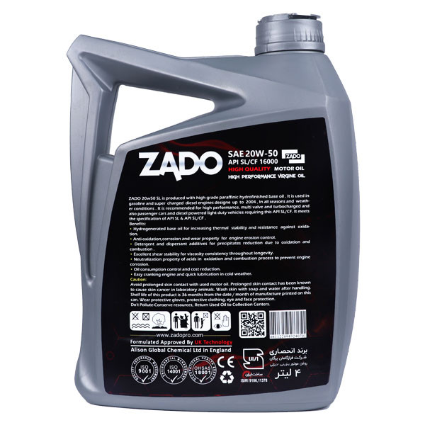 روغن موتور خودرو زادو مدل SAE 20W50-SL حجم 4 لیتر