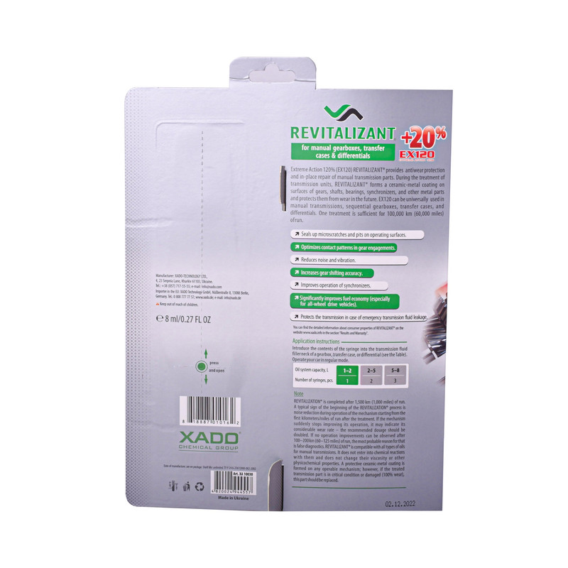 بسته بندی جدید //// مکمل زوزهگیر و احیاگر گیربکس دندهای اکسادو مدل EX120 فرموله شده به صورت ویژه برای بازسازی گیربکس های عادی و دیفرانسیل در حین کارکرد می باشد. در فرآیند احیاء اصطکاک کاهش یافته، سطوح سایشی گیربکس، دیفرانسیل، جعبه انتقال قدرت و... ترمیم شده و لایه محافظ نانو سرامیکی برای جلوگیری از فرسایش آتی قطعات تشکیل می شود و بدین ترتیب پروسه تعمیر بدون نیاز به باز کردن گیربکس صورت میگیرد. این محصول قابل استفاده در انواع گیربکس های عادی (دستی) و دیفرانسیل میباشد و استفاده از این محصول طول عمر کلیه قطعات گیربکس را افزایش و عمر سرویس دهی سیستم را ارتقاء داده و از تعمیرات گرانقیمت جلوگیری مینماید. از این محصول در تمامی خودروهای گیربکس دستی (حتی خودروی صفر کیلومتر) جهت محافظت از قطعات تحت سایش استفاده می شود. در اصل با استفاده از این محصول، گیربکس خودروی خود را بیمه خواهید کرد که حتی در صورت خالی شدن روغن گیربکس، هیچ آسیبی به گیربکس خودروی شما وارد نمی شود. این محصول دارای 120 درصد توان احیاء و محافظت است. در نتیجه دارای مقدار کافی عامل احیاگر برای تکمیل کامل پروسه احیاء می باشد. این احیاگر قدرتمندترین احیاگر زادو برای سیستم انتقال قدرت خودرو است. لطفا توجه فرمایید نوشته های روی بسته بندی و سرنگ محصول و نوع سرنگ محصول با توجه به سفارش کشورهای مختلف ممکن است متفاوت باشد.