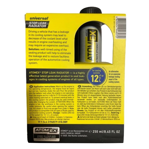 رادیاتور و سیستم خنک کننده بر اثر حرارت زیاد یا سپریشدن عمر مفید، ممکن است دچار نشتیهای مختلفی شود که مالک مجبور خواهد شد برای رفع این نشتیها، زیر بار هزینههای بسیاری برود. نشت گیر رادیاتور و سیستم خنک کننده اکسادو مدل Stop Leak Radiator به صورت یک قوطی 250 میلیلیتری مناسب برای حداکثر 10 تا 12 لیتر آب رادیاتور بستهبندی شده است. این محصول هرگونه نشتی مانند ترک سیلندر، واشر سرسیلندر نیمسوز، گسکت واترپمپ و نشتی رادیاتور در سیستم خنککننده موتور خودرو را رفع میکند. رفع این نشتیها با اثربخشی بالا و بهشکل دائمی خواهد بود. از این نشتگیر علاوهبر پیشگیری، جهت جلوگیری از رسوب و زنگزدگی در سیستم خنککننده پس از تعویض آب رادیاتور نیز استفاده میشود. از مزایای نشت گیر رادیاتور و سیستم خنک کننده اکسادو میتوان به ترمیم و نشتگیری میکروترکها تا 0/9 میلیمتر، هزینه نکردن برای تعمیرات گران قیمت، محافظت از سیستم خنککننده موتور برای مدتزمان طولانی، نبودن مواد اسیدی، واکنش و اثر منفی نداشتن بر روی اجزای سیستم خنککننده (گسکتها، جنتها، رادیاتورهای استیل، پلاستیک، آلومینیومی و غیره) و قابل استفاده بودن برای انواع اتومبیلهای بنزینی و دیزل اشاره کرد.
