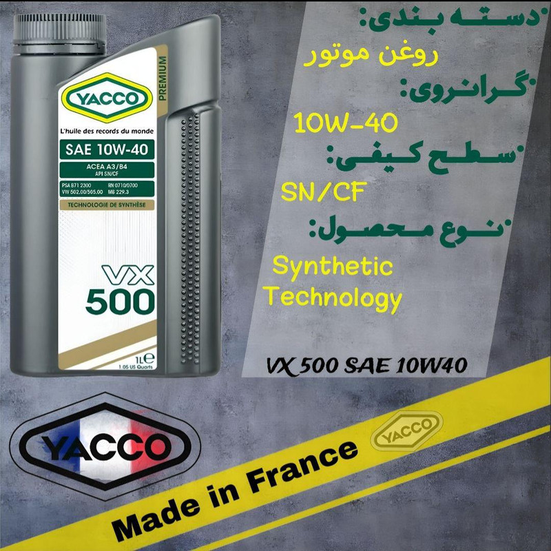 روغن موتور VX500 یاکو تولید شده کشور فرانسه و وارداتی میباشد ، روغن موتور تمام سنتتیک، با داشتن حجم 1 لیتری و میزان گرانروی 10W-40 عرضه شده است. سطح کیفی این روغن موتور SN/CF می باشد. روغن VX500 یاکو مناسب برای خودرو های بنزینی و دیزلی میباشد که بالاترین سطح کیفی تولید کشور فرانسه میباشد.