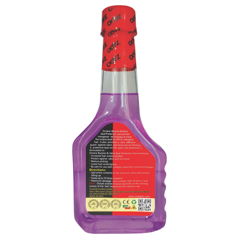 اکتان بوستر پلاس زادو با حجم 300 میلی لیتر یک افزودنی چند منظوره برای سوخت بنزین است. این محصول به منظور جلوگیری از احتراق زودرس که در سوخت بنزین با اکتان پایین متداول است فرموله شده و به موتور در تمام موقعیت های حرکت و شتاب کمک میکند. این محصول مصرف جهانی داشته و عدد اکتان سوخت را با توجه به نوع بنزین بین 3 الی 5 واحد افزایش میدهد.