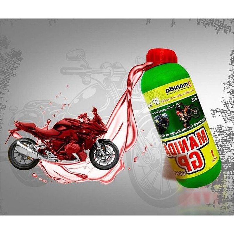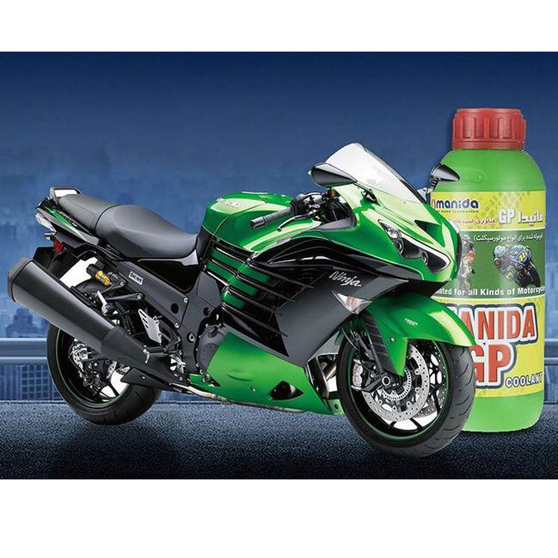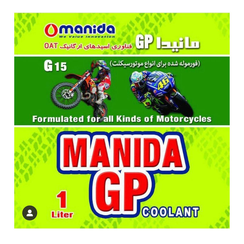 این محلول از برند با کیفیت مانیدا ضد زنگ،ضدجوش،ضدیخ،ضدکف،ضد رسوب و محافظ سیستم خنک کننده موتور سیکلت می باشد COOLANT ضدیخ موتور سیکلت مانیدا با بطری ابی و سبز دارای استاندارد ملی 338 و فرمولاسیون مخصوص موتور سیکلت اماده مصرف بدون نیاز به افزودن اب و قرمز رنگ می باشد همچنین دارای تبادل گرمایی بالا و دارای فناوری اسیدهای ارگانیک OAT می باشد، این محلول مناسب برای تمام موتور سیکلتهای دارای رادیات سبک و سنگین YAMAHA SUZUKI KAWASAKI ، HONDA،VESPA ، DUCATTI ، KTM ، BMW،BENELLI از هوندا کلیک 125CC تا SUZUKI BKING1400CC است. کیفیت و تکنولوژی ساخت در این برند نسبت به برندهای ایرانی و چینی به مراتب بالاتر بوده و سیستم اب خنک موتور سیکلت شما را در سردترین و گرمترین نقاط کشور در بهینه ترین حالت قرار می دهد. خنک کردن مناسب موتور یکی از کارهای بسیار حساسی است که تاثیر مستقیمی روی عملکرد موتور سیکلت و خودرو و عمر مفید موتور دارد. برای این منظور از سیالات خنک کنندهای مانند آب و ضدیخها استفاده میشود. محصول فوق را از لحاظ عملکرد میتوان در گروه ضدیخها و ضدجوشها قرار داد؛ با این تفاوت که از مزایای دیگری نیز برخوردار است. این ضدیخ خاصیتی محافظتی داشته و قادر است در مسیر حرکتی خود از بخشهای فلزی و لاستیکی رادیاتور و سیستم خنک کنندهی خودرو محافظت کند. از جملهی فواید محافظتی این محصول میتوان به قابلیتهای ضد زنگ، ضدخوردگی، ضد رسوب و ضد کاویتاسیون اشاره کرد. این محلول هیچ اثر زیان آوری برای سیستم خنک کنندهی موتورسیکلت ندارد و با ترکیبات ویژهای که دارد دمای انجماد و جوش را دستخوش تغییر کرده است. این محلول تا دمای مثبت 112 درجهی سانتیگراد جوش نمیآید و تا دمای منفی 37 درجهی سانتیگراد دچار یخ زدگی نمیشود. این محصول را نباید با آب ترکیب کرد و شرکت «مانیدا» (Manida) آن را تحت عنوان مدل «GP» به بازار عرضه میکند.