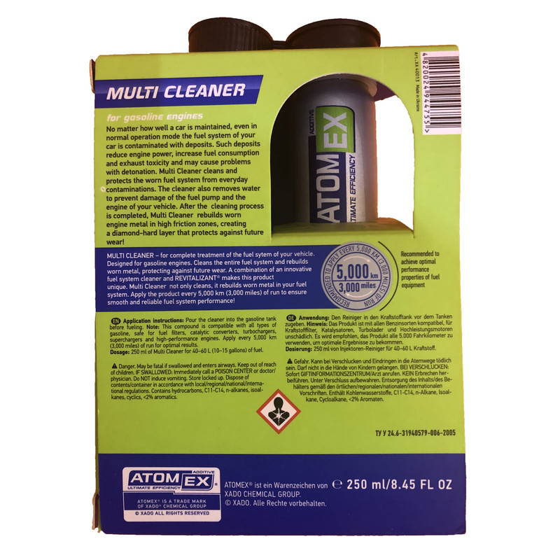 همه اتومبیلها در شرایط عادی همواره مستعد آلودگی سیستم سوخت هستند. چنین آلودگیهایی قدرت خروجی موتور را کاهش داده، مصرف سوخت و گازهای آلاینده خروجی موتور را افزایش میدهد. «مالتی کلینر اتمیکس» سیستم سوخت اتومبیل را از آلودگیهای روزانه محافظت میکند. این محصول همچنین آب را از سوخت جدا میکند تا باعث خرابی پمپ بنزین و موتور نشود. مالتی کلینر اتمیکس باعث ترمیم و بازسازی سطوح ساییده شده پمپ بنزین میشود.