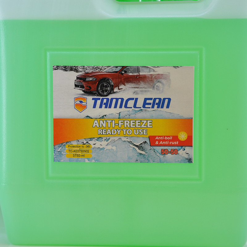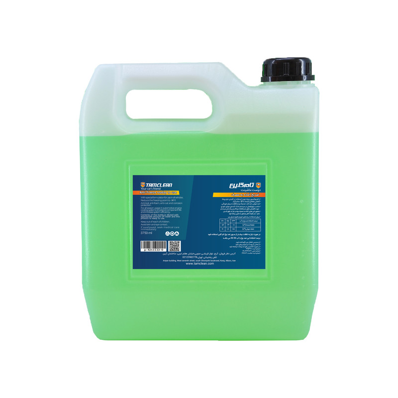 ضدیخ و ضدجوش خودرو تام کلین مدل TC-AE3750N02 با حجم 3750 میلی لیتر متشکل از مایع ضدیخ و ضدجوش به همراه افزودنی های مفید جهت ایجاد خاصیت ضدخوردگی و ضدزنگ زدگی سیستم خنک کننده ی موتور می باشد. این محصول بر اساس فرمولاسیون ویژه ای تولید شده است که جهت استفاده برای انواع موتورهای خودرو مناسب بوده و برخلاف ضدیخ های قدیمی، دارای ویژگی هایی غیر مخرب می باشد. محتویات این بطری آماده به مصرف بوده و تا دمای 36- درجه سانتی گراد در برابر یخ زدگی مقاومت می نماید. از این رو با توجه به شرایط آب و هوایی ایران توصیه می شود که رادیاتور خودرو را بدون اضافه کردن آب با آن پر نمایید. از آنجا که یکی از مهمترین ویژگی های این محصول محافظت از سیستم خنک کننده ی خودرو می باشد توصیه می شود این ماده در تمام طول سال به عنوان مایع خنک کننده ی موتور استفاده شود. این محصول جهت استفاده برای موتور های چدنی، آلومینیومی و رادیاتورهایی با آلیاژ مس و یا آلومینیوم مناسب است و خاصیت ضدجوش آن در فصل گرما نیز موجب بهبود راندمان سیستم خنک کننده ی موتور می شود.