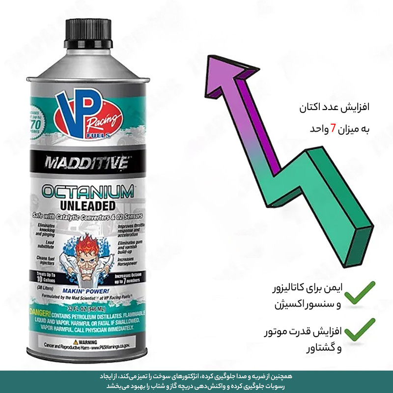 مکمل سوخت VP OCTANIUM UNLEADED با حجم 946 میلی لیتر است از ویژگی های این محصول افزایش قابل توجه کیفیت سوخت، افزایش 7 عدد اکتان (70 پوینت)، رفع ناک، افزایش توان و گشتاور قابل توجه (تست شده بر روی دستگاه دینامومتر)، شستشوی مدار سوخت و سلامت موتور خودرو و همچنین می توانید در استفاده شهری بدون تهیه سوخت مسابقه راندمان بالایی داشته باشید. شرکت VP همان تولید کننده سوخت های مسابقه ای می باشد که خودرو های مدرن اسپرت شهری ، تیونینگ شده و آفرود و همچنین خودروهای حساس به کیفیت سوخت پایین می توانند از این مکمل بهره مند شوند. این محصول مناسب استفاده با انواع بنزین (سوپر و معمولی) بوده و هیچ آسیبی به کاتالیست و سنسور های اکسیژن (معمولی و وایدبند) خودرو نمی رساند. اکتان بوستر و مکمل سوخت وی پی از محبوب ترین برندها در دنیای مکمل سوخت است که علاوه بر رفع ناک زدن موتور، موجب افزایش چشمگیر شتاب و توان موتور می گردد همچنین روانکاری بالا جهت حرکت راحت رینگ پیستون، محافظت از سیت سوپاپ و کاهش مصرف سوخت از ویژگی های بارز این اکتان می باشد. اکتان بوستر و مکمل سوخت وی پی از جمله قویترین و پرطرفدار ترین اکتان بوسترهای دنیاست که بر خلاف برخی از اکتان های دیگر، برای خودروهای توربو، شش و هشت سیلندر نیز بسیار مفید و کاربردی بوده و یک تقویت کننده عملکرد خالص و واقعی است که کاملا برای سنسورهای اکسیژن و مبدل های کاتالیزور نیز ایمن است. به طور کلی این محصول را می توان بهترین اکتان بوستر دنیا دانست که علاوه افزایش 70 پوینتی عدد اکتان، تمامی سیستم سوخت را تمیز میکند و رسوبات از بین میبرد و از تشکیل مجدد آن ها جلوگیری میکند و همچنین موجب افزایش گشتاور و اسب بخار خودرو شده و واکنش دریچه گاز و شتاب بهبود می دهد و علاوه بر رفع ناک و خام سوزی جایگزین سرب هم هست و به علاوه کاملا سازگار با سنسورهای اکسیژن و مبدل های کاتالیست هم نیز می باشد. این محصول به گونه ای تولید شده است که بر خلاف مدل 80 پوینت برای خودروهای دارای مبدل کاتالیزور مناسب می باشد.