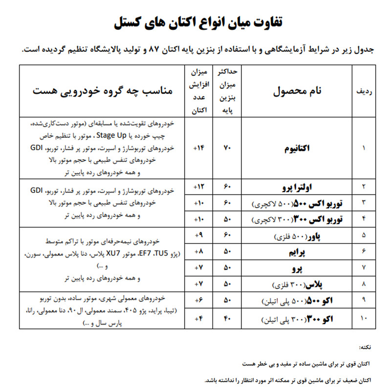 استفاده از این محصول باعث جلوگیری کامل از پدیده ناک (ضربه زدن موتور)، احتراق ناقص و ریپزدن در زمان شتابگیری میشود و در نتیجه عمر مفید موتور را افزایش میدهد. اکتان بوستر کستل کاملاً با سنسور اکسیژن، مبدل کاتالیست و سیستمهای مدیریت پیشرفتهی موتور سازگار است و بدون ایجاد هیچگونه اختلال در عملکرد این بخشها، به بهبود عملکرد کلی خودرو کمک میکند.