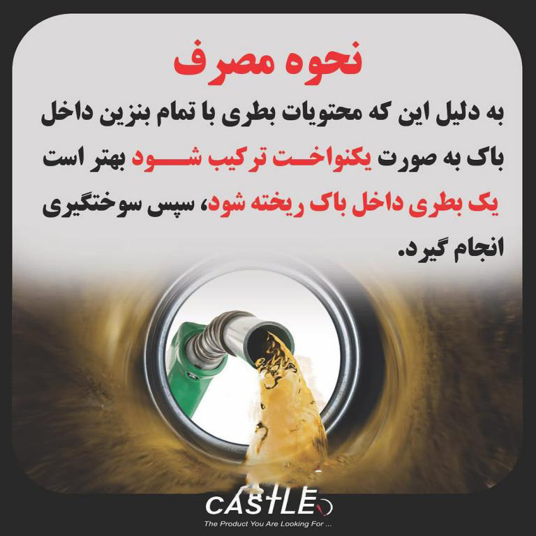 روش استفاده: قبل از سوختگیری یک بطری کامل را داخل باک بریزید. سپس بلافاصله سوخت گیری نمایید تا مواد به خوبی با بنزین ترکیب شود. مناسب برای 30 تا 50 لیتر بنزین