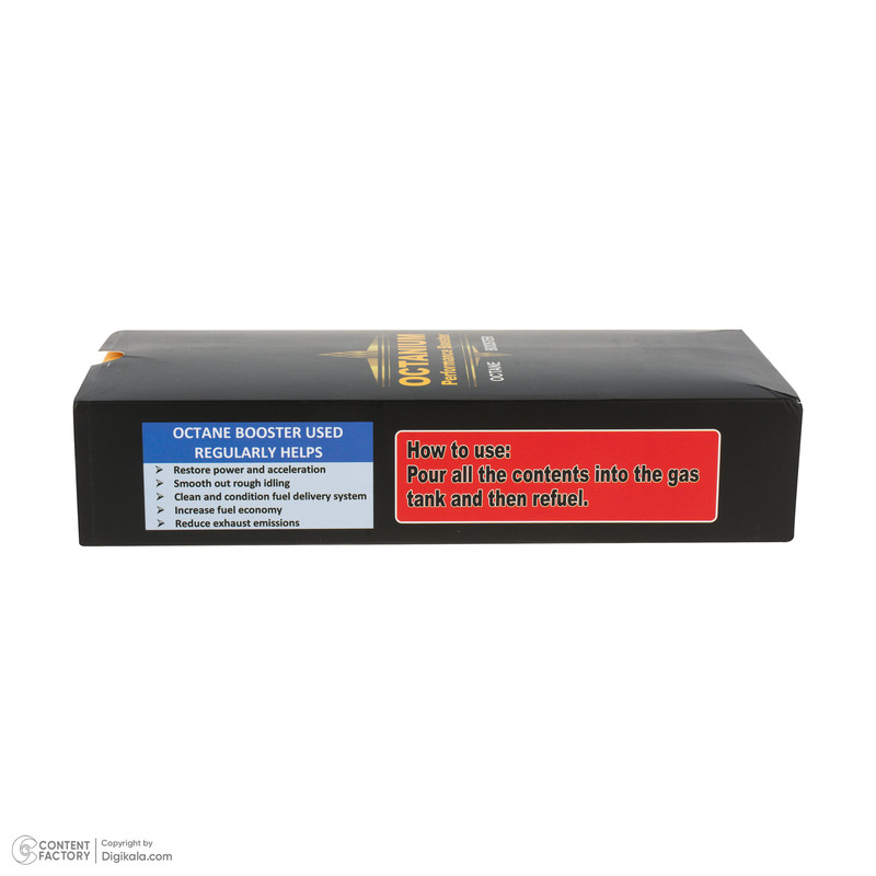 روش استفاده: قبل از سوختگیری یک بطری کامل را داخل باک بریزید. سپس بلافاصله سوخت گیری نمایید تا مواد به خوبی با بنزین ترکیب شود. مناسب برای 40 تا 60 لیتر بنزین