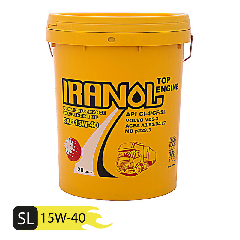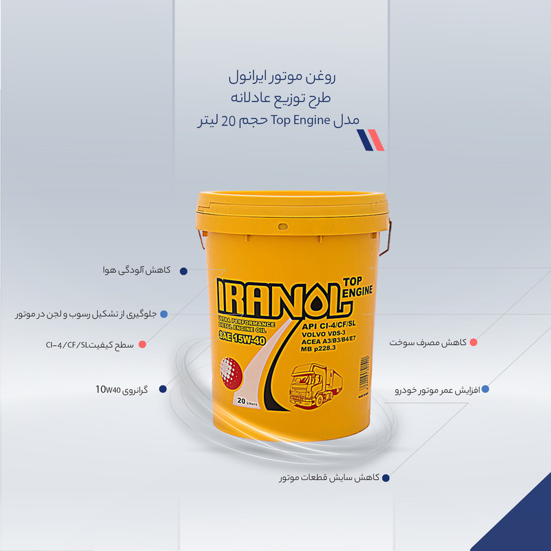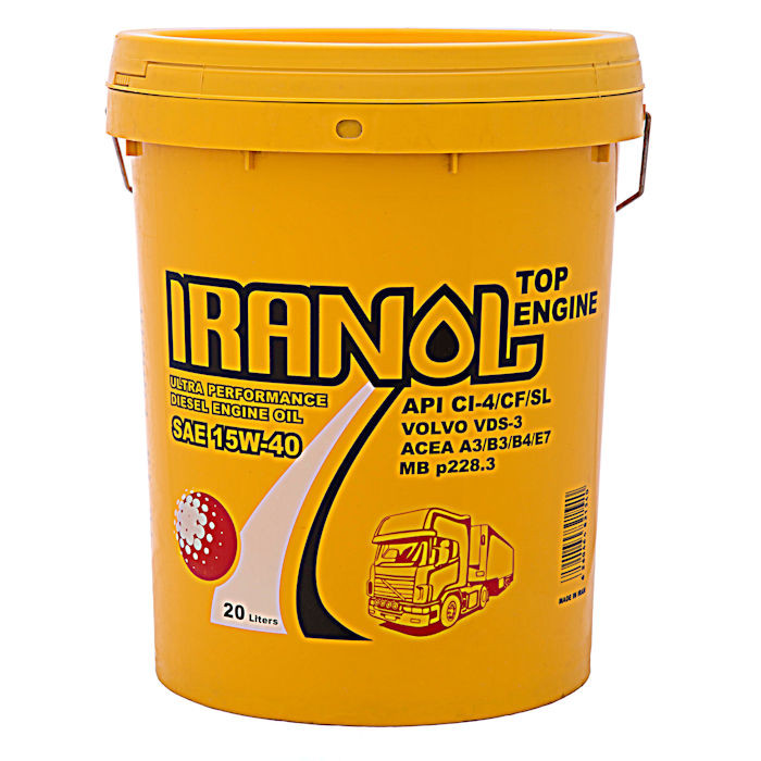ایرانول Top Engine با استفــاده از روغن پایهی گزينش شده و مواد افزودنی بسيار مرغوب، جهت مصرف در جديدترين مدلهاي موتورهای دیزلی سنگین به منظور استفاده در تمامی فصول و شرایط آب و هوایی ایران تولید گردیدهاست.