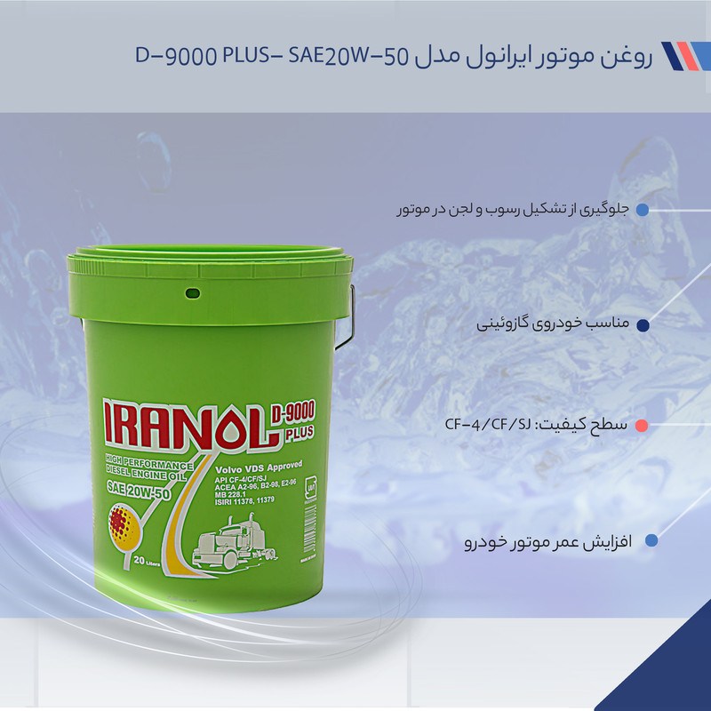 ایرانول D-9000 PLUS با استفاده از روغن پایه پارافینیک حاصل از پالایش برشی از نفت خام با شاخص گرانروی بالا و انجام فرآیند هیدروژناسیون (Hydro finishing) و مواد افزودنی مناسب جهت مصرف در موتورهای دیزلی سنگین تولید گردیده است.